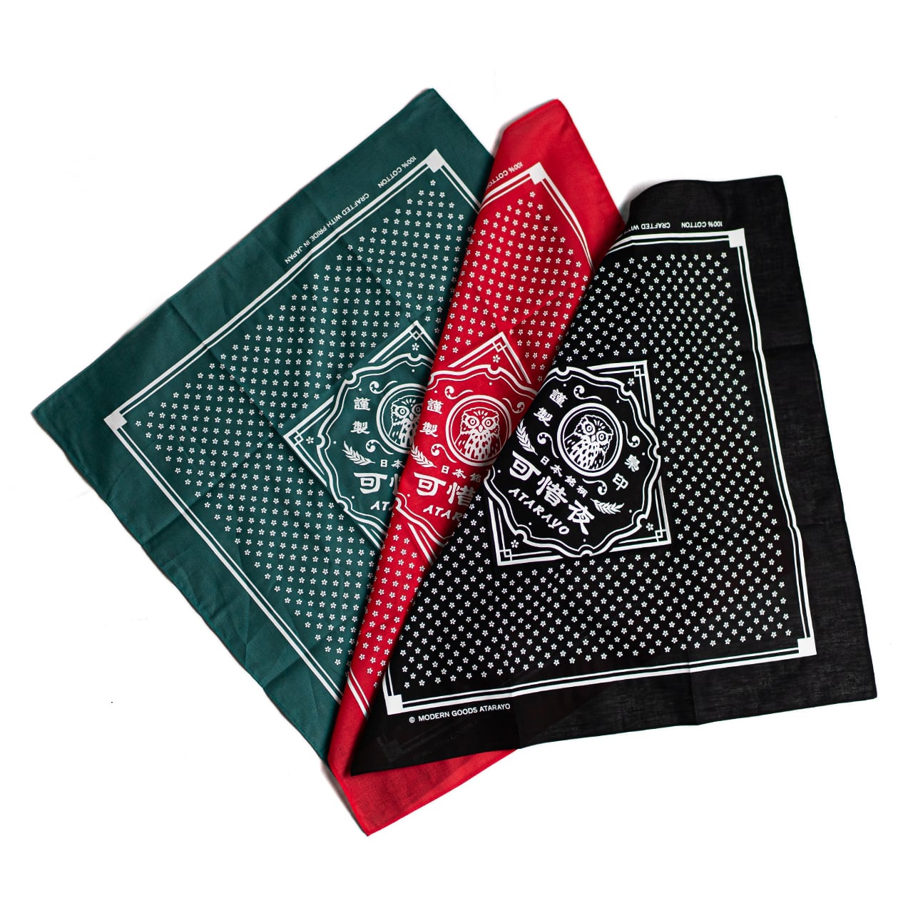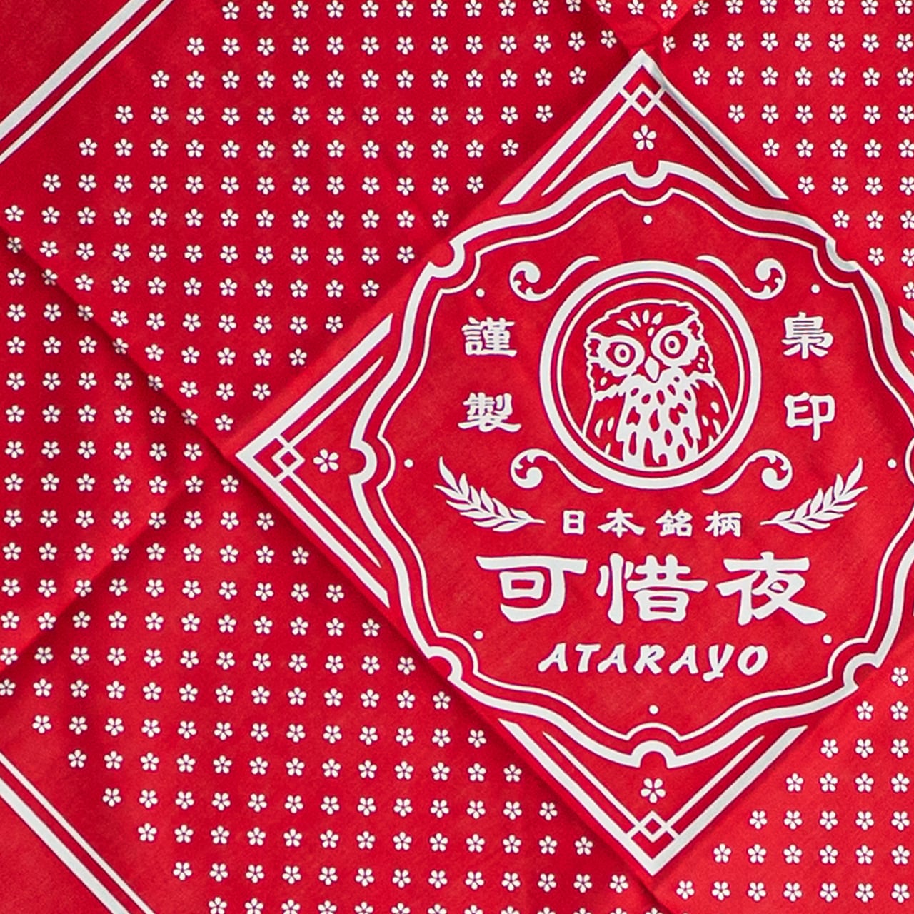 日本酒のラベルのようなロゴに細かなドット部が桜になっている遊び心満載のバンダナです。アウトドアシーンでは欠かせないバンダナですが、普段使いとしても楽しめるアイテムです。